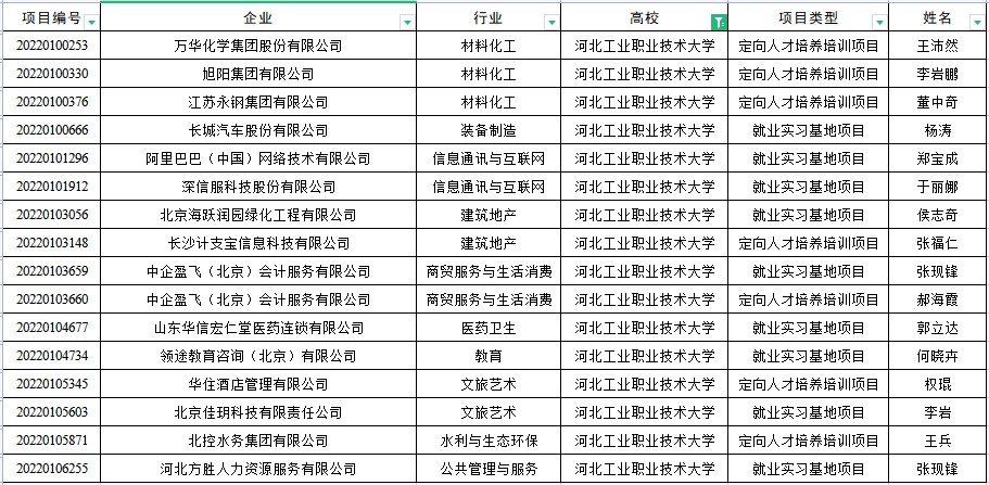 本次项目由教育部高校学生司组织,在落实党中央、国务院“稳就业”“保就业”决策部署,深化产教融合、校企合作,推动人才培养与就业有机联动、人才供需有效对接的大背景下开展。我校积极与进入项目建设名单的校企合作单位进行沟通,组织8个院系与企业共同研讨、积极筹备、组织申报,最终与万华化学集团股份有限公司、旭阳集团有限公司、江苏永钢集团有限公司、长城汽车股份有限公司、阿里巴巴(中国)网络技术有限公司、深信服科技股份有限公司、北京海跃润园绿化工程有限公司、长沙计支宝信息科技有限公司、中企盈飞(北京)会计服务有限公司、山东华信宏仁堂医药连锁有限公司、领途教育咨询(北京)有限公司、华住酒店管理有限公司、北京佳玥科技有限责任公司、北控水务集团有限公司、河北方胜人力资源服务有限公司共计15家企业在定向人才培养培训项目、就业实习基地项目、人力提升项目三个方面立项合作,为持续提升我校毕业生就业竞争力提供了新的契机。