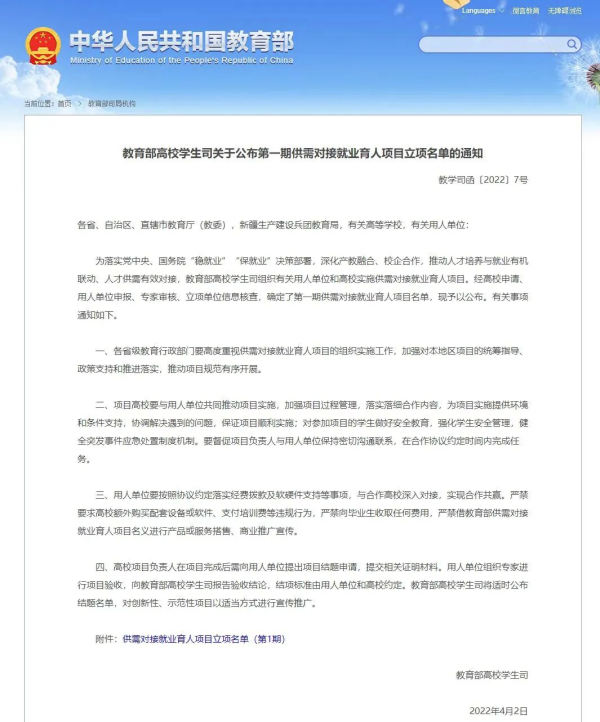 近日,教育部高校学生司《关于公布第一期供需对接就业育人项目立项名单的通知》(教学司函〔2022〕7号)发布,我校与15家企业合作的16个就业育人项目获得教育部首批立项,此次立项将推动校企产学研合作的进一步深化,助力我校培养更多高素质技术技能人才。