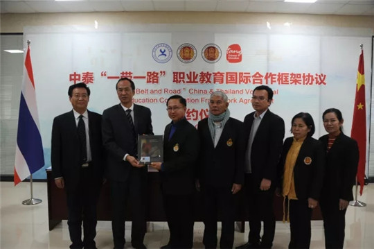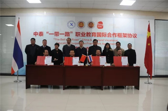 随后,我院与泰国北部第二区职业教育中心、泰国清莱职业学院、北京唐风汉语教育科技有限公司签署《中泰“一带一路”职业教育国际合作框架协议》,四方共同探索开展“互联网+面授”的国际合作办学模式,合作内容包括汉语教育、专业教学、合作办学、师生交流、留学游学、实训实习、升本就业等方面。该项目将于2019年启动实施。中泰双方将以旅游管理和物流管理专业为起点,以“汉语+专业技能+产业”的形式,由中泰双方共同制订人才培养方案,通过学分互认和课程共建,采取“1+2”模式为泰方培养相关专业人才。同时,在泰方挂牌成立我院的海外分校,协助泰国中资企业开展技术技能培训和学历职业教育,共同培养和培训一批服务“一带一路”倡议和“泰国4.0计划”的高素质技能型人才。