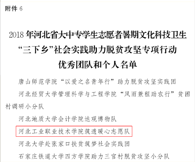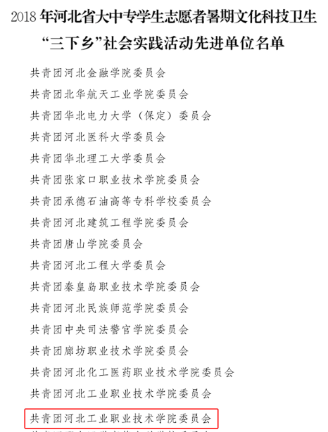 近日,中共省委宣传部、团省委、省文明办、省教育厅、省人力社厅、省扶贫办联合下发了《关于2018年河北省大中专学生志愿者暑期文化科技卫生“三下乡”社会实践活动先进集体和个人的通报》,对社会实践中表现突出的优秀团队和先进个人进行了通报表彰。其中,我院团委荣获活动先进单位、计算机技术系魏鸿影音实践分队荣获活动优秀团队、汽车工程系筑遗暖心志愿队荣获助力脱贫攻坚专项行动优秀团队。