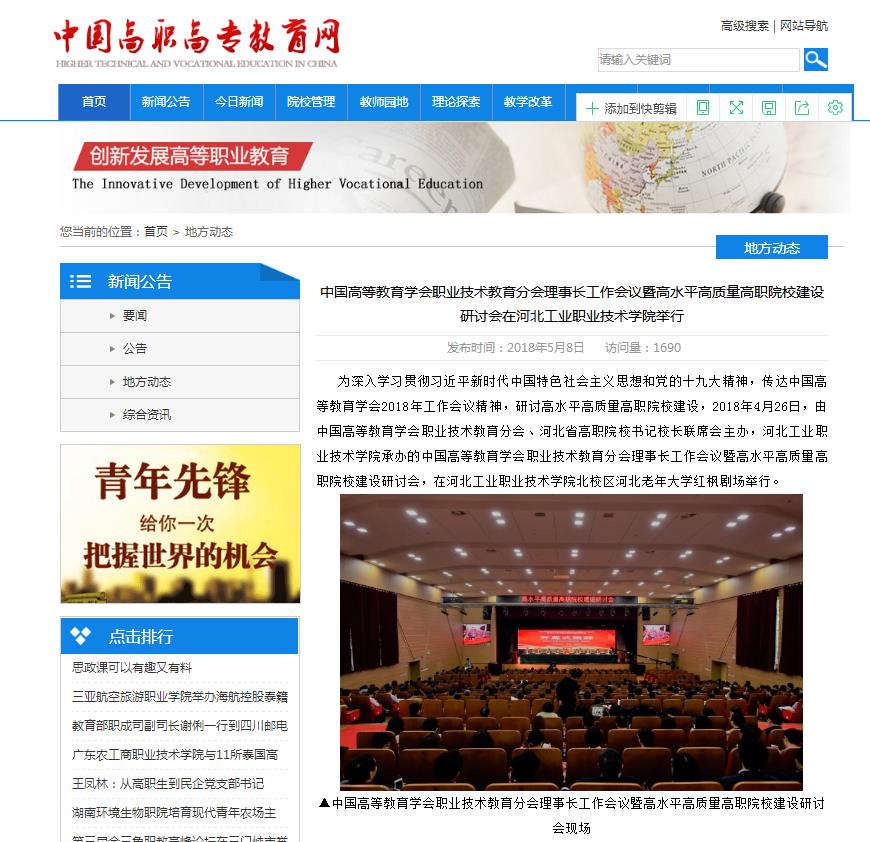 中国高职高转教育网报道中国高等教育学会职业技术教育分会理事长工作会议暨高水平高质量高职院校建设研讨会在我院举行。