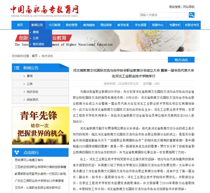 中国高职高转教育网报道报道河北省教育文化国际交流与合作协会职业教育分会成立大会暨第一届会员代表大会在我院举行。