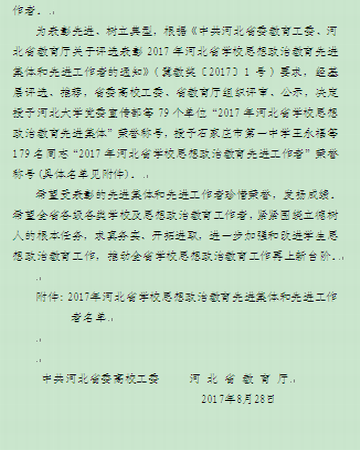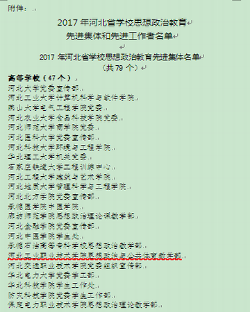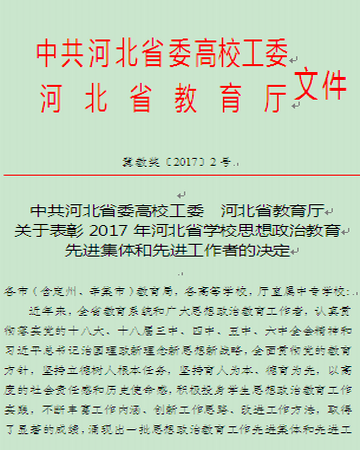 日前,中共河北省委高校工委、河北省教育厅下发了《关于表彰2017年河北省学校思想政治教育先进集体和先进工作者的决定》,我院思想政治与公共体育教学部荣获“2017年河北省学校思想政治教育先进集体”。