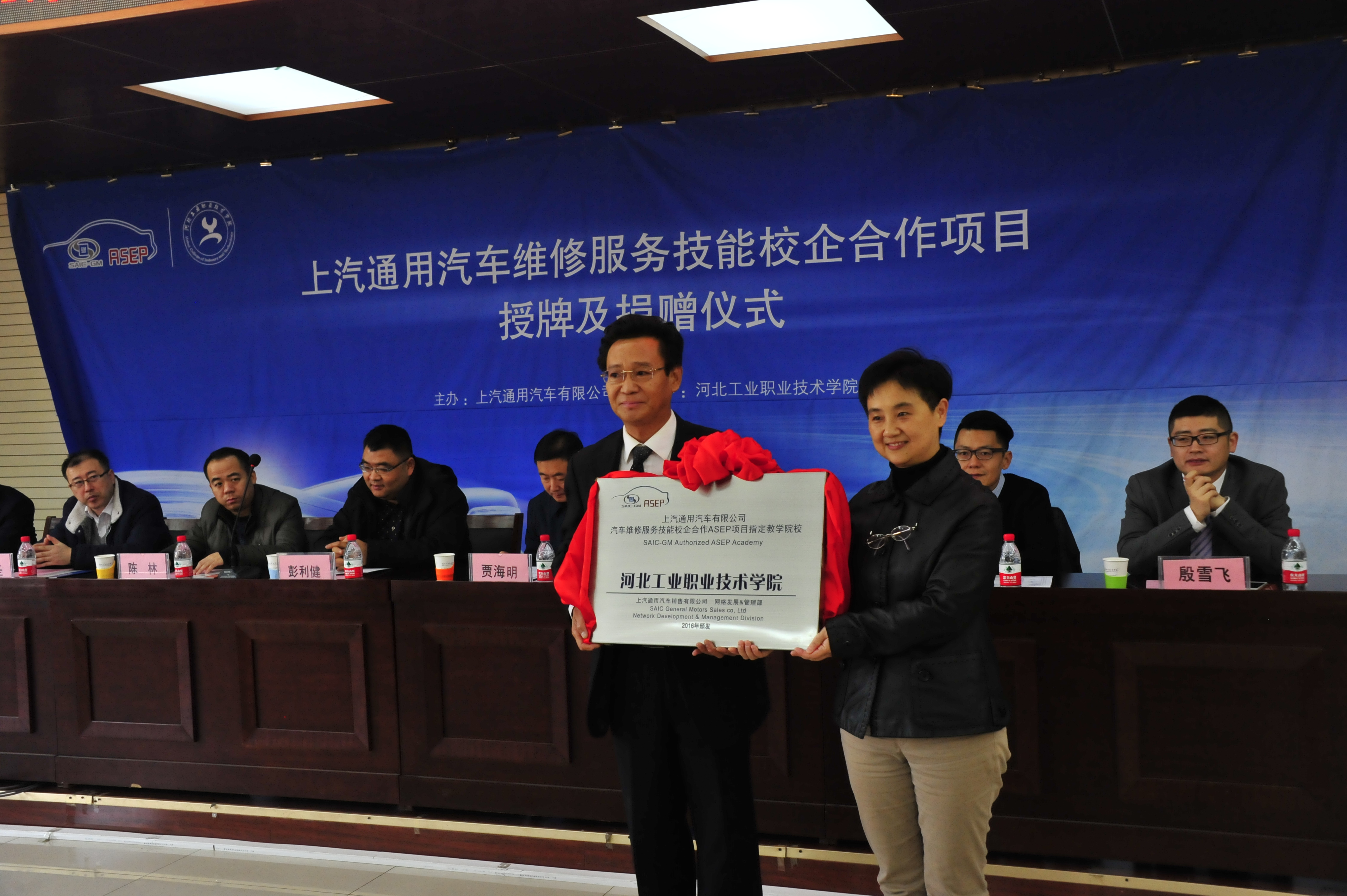 12月23日,上汽通用汽车ASEP项目授牌暨赠车仪式在我院举行。河北省教育厅贾海明副厅长、上汽通用汽车有限公司校企合作项目组白小璎经理、ASEP校企合作项目培训规划主管张霆、殷雪飞、范圣、上汽通用汽车售后服务事业部彭利健经理、别克品牌事业部陈林经理及上汽通用汽车相关品牌经销商代表出席会议。学院王振杰书记、贾俊礼院长、付俊薇副院长、学院相关处室及汽车工程系等100多名师生参加。付俊薇副院长主持仪式。