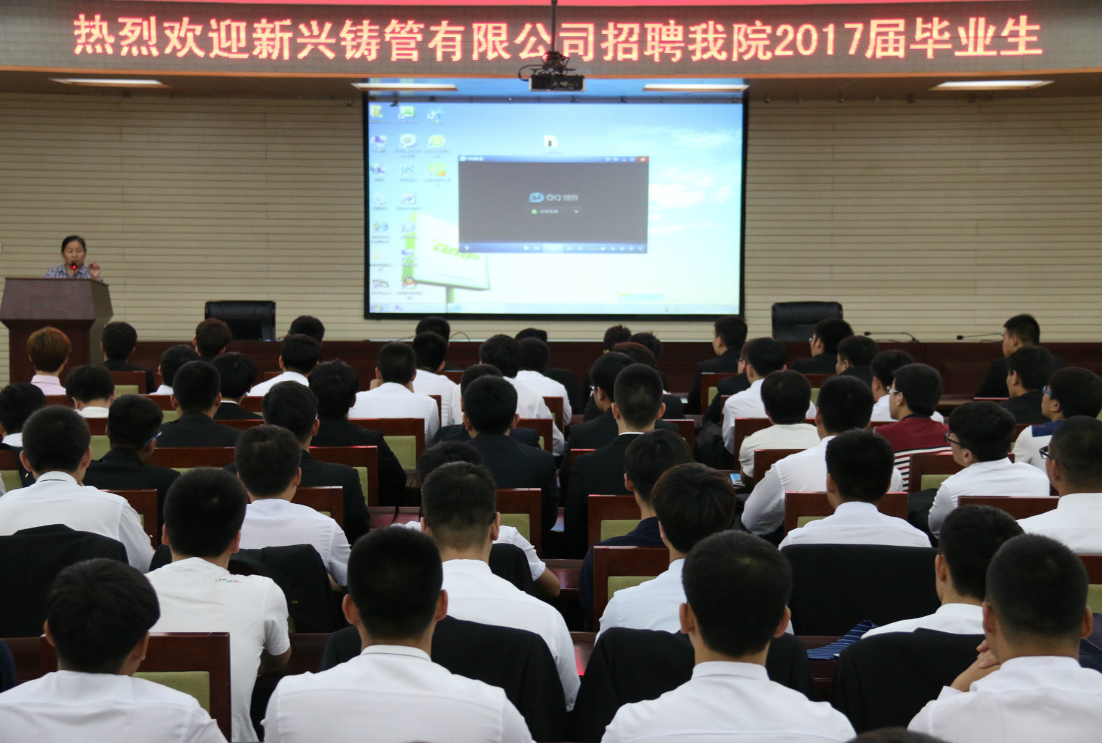 5月26日,新兴铸管股份有限公司人力资源部寇延琴主任一行两人来我院招聘2017届毕业生。经过宣讲、面试、投递简历、签约等环节,共有81名同学被单位正式录用,其中材料工程系63人,机电工程系17人,信息工程与自动化系1人,并现场与单位签订了就业协议书、实习协议书。