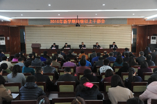 2月26日上午,我院在南校区五楼报告厅召开2016年新学期科级以上干部大会,安排部署2016年度工作。会议由党委书记王振杰主持。学院院长贾俊礼、副院长付俊薇、韩提文、张福仁出席会议,全体科级以上干部参加大会。