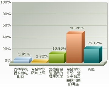同学们的生活学习离不开学院构建的和谐环境和有效管理,通过“你认为学院对于保障学生睡眠质量还可以做哪些改进?”这一问题的调查反馈,很多同学纷纷提出了自己的建议。根据反馈数据(图8)显示,5.95%的同学支持学校提前断电时间,2.32%的同学希望学院限制上网,15.85%的同学希望通过加强宿舍管理员的管理力度来强制自己包括室友提早入睡。除了这些带着些“强制性”色彩的措施外,还有50.76%的同学希望学院开设一些关于解决睡眠问题的讲座,更好的了解睡眠的重要性,调整自己的睡眠问题。另外一些“合理地安排课程和考试周期”、“按同学睡觉时间分配宿舍”和“晚上提前半小时下课”等建议,也从某个角度反映了同学们的想法。
