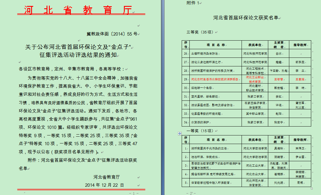 为贯彻落实党的十八大、党的十八届三中全会精神,加强全省环保教育工作,由省教育厅组织开展了首届环保论文及“金点子”征集评选活动。此次活动在全省本专科院校中共征集了环保论文1010篇,经过专家评审、优中选优,共评选出获奖论文84篇,其中由我院绿色之友协会王智慧同学撰写、王惠娟老师指导的论文《河北农村生活污水排放现状调研》喜获三等奖。