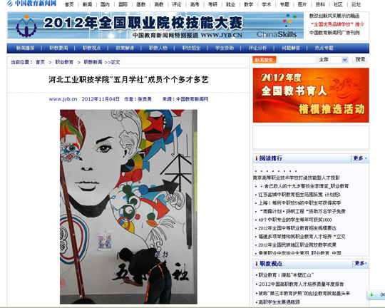 11月2日,高等职业教育服务青年成长发展暨第五届国家示范性高职院校建设成果展示会在山东省潍坊市举行。会议期间举办了高职院校社团活动现场展示与交流会。展示会上,我院五月学社的展区得到了与会者的高度评价,吸引了全国各大媒体争相报道。