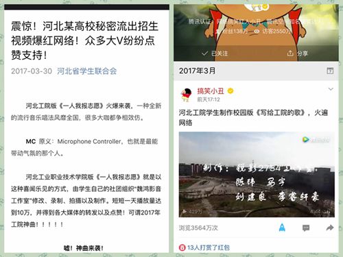 魏鸿影音工作室自2014年成立以来,一直以摄影、微视频制作为主要实践内容,2016年在自媒体平台及优酷视频首次制作的网络校园街坊《卜卜眼》第一季以50万点击量完美收官,获得学生群体的极大关注;2017年在学院支持下,以“服务青年、引领思想”为宗旨策划的微视频《我们正青春》将联手新浪微博,助力学生成长;同时制作包含文艺、青春、娱乐以及贴近于学生的事实话题电台栏目《花生奶糖》通过微信公众账号的形式进行推送,节目一经播出就获得许多同学的认可,并得到上千名同学的转发及点赞。而此次,魏鸿影音改编网络红人节目制作《一人我报志愿》以招生季为背景、用诙谐的画面表现形式结合神曲般的节奏爆红网络,获得河北省学生联合会微信公众平台的发布,3月27日上线仅一天播放量达到10万,被称为“工院神曲”。