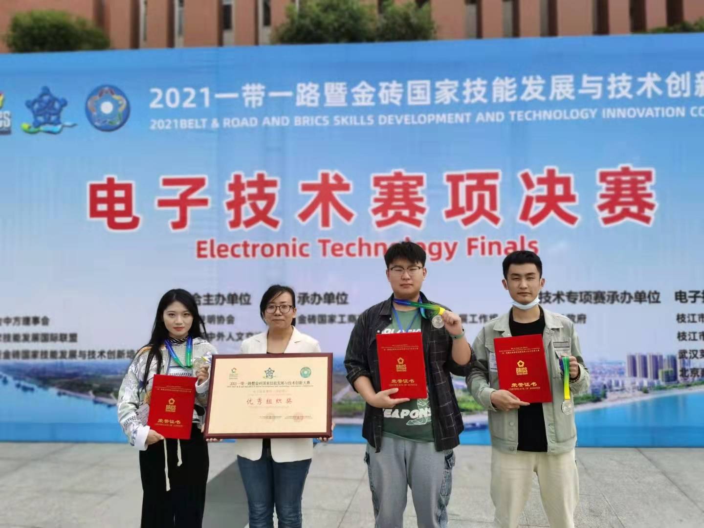 10月11日至10月13日,在由金砖国家工商理事会中方理事会和一带一路暨金砖国家技能发展国际联盟主办、中国发明协会和教育部中外人文交流中心联合主办的“2021一带一路暨金砖国家技能发展与技术创新大赛-电子技术大赛”国内决赛在枝江市职业教育中心成功举办。本次大赛的参赛队伍来自全国各地的29支高职院校参赛队和14支中职院校参赛队,共115名选手参加。经过激烈角逐,我校智能制造学院索琳、陈思豪和杨贵海三位同学荣获该赛项团体二等奖,我校荣获“电子技术”大赛“优秀组织奖”,胡雪花、张华两位老师被评选为“优秀指导教师”。